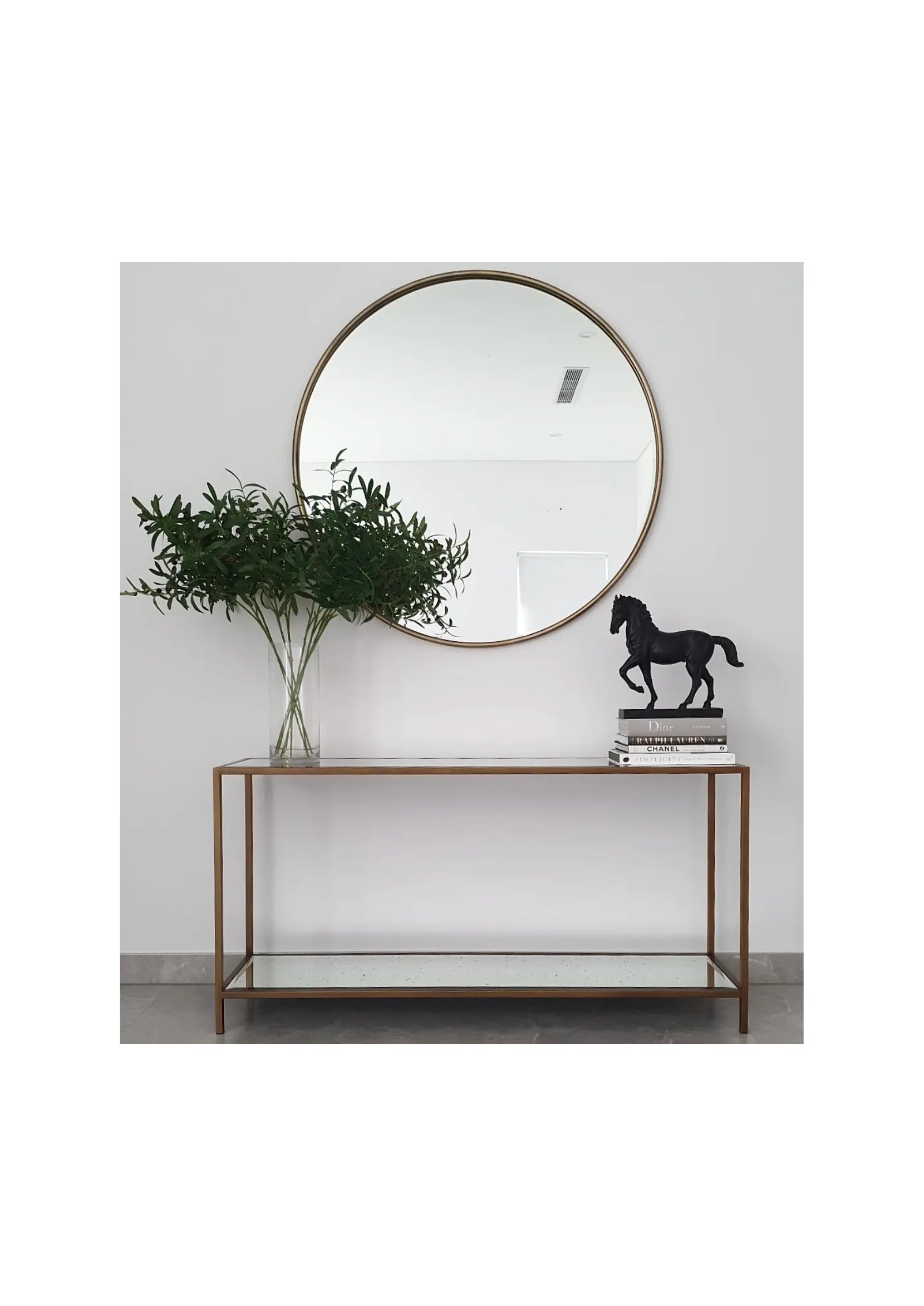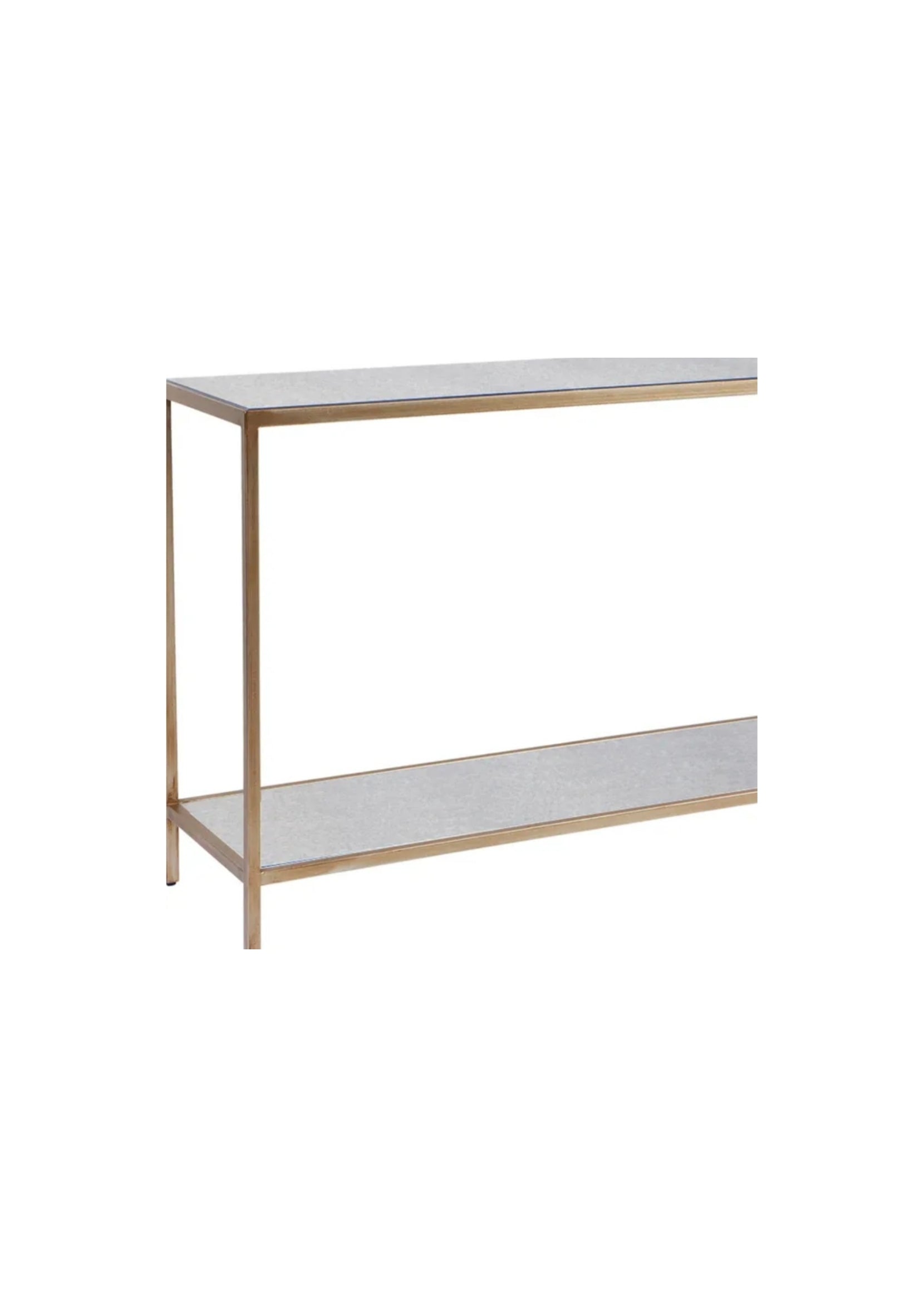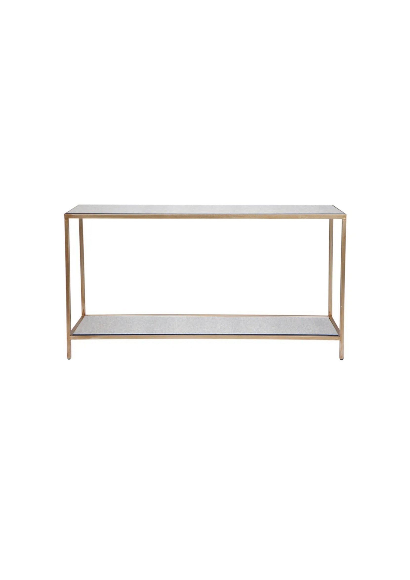 - The Newport range is the perfect collection for adding a touch of class and function to your home with a slender and open design. Crafted with an iron frame in a myriad of finishes. The Newport console table is an elegant piece for a refined home with delicate proportions finished in an antique gold hand painted finish, accented by inlaid bevelled-edge antiqued mirror. A curators haven, the dual shelf design creates interest in your living space, or a statement in your hallway and entry.