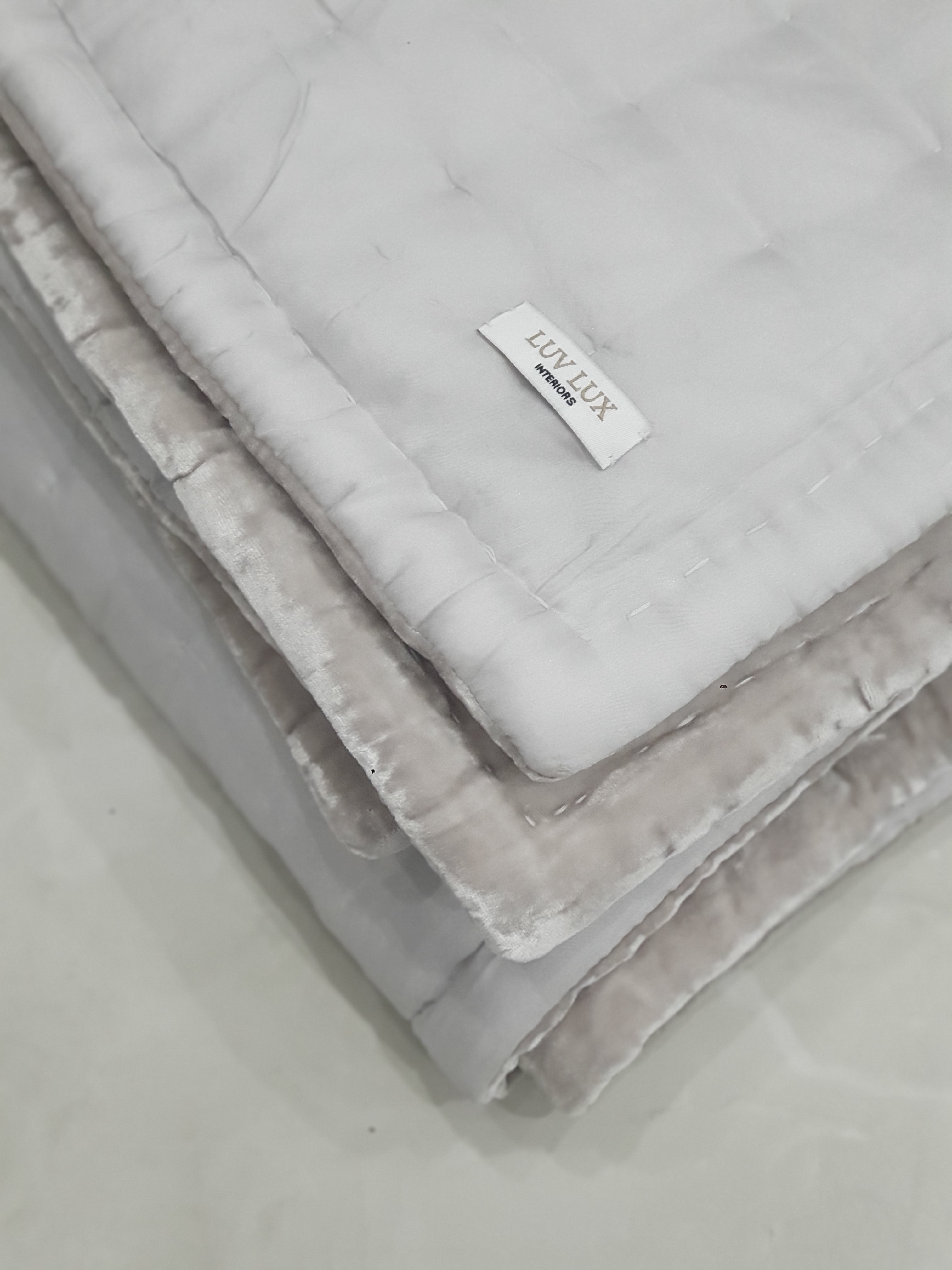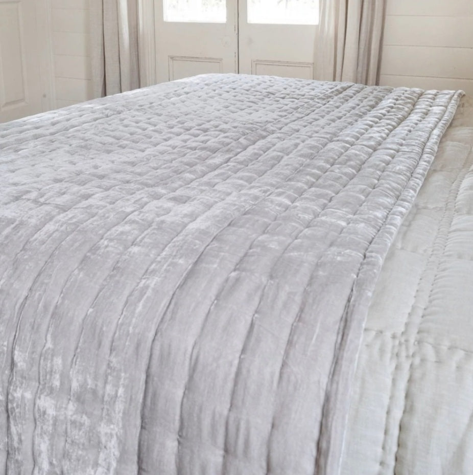 A stunning, lightweight, reversible, padded throw in gorgeous Oyster silk velvet and natural linen. An opulent design that is beautiful to touch and adds a rich, warm, dramatic highlight to the bedroom or lounge area.
