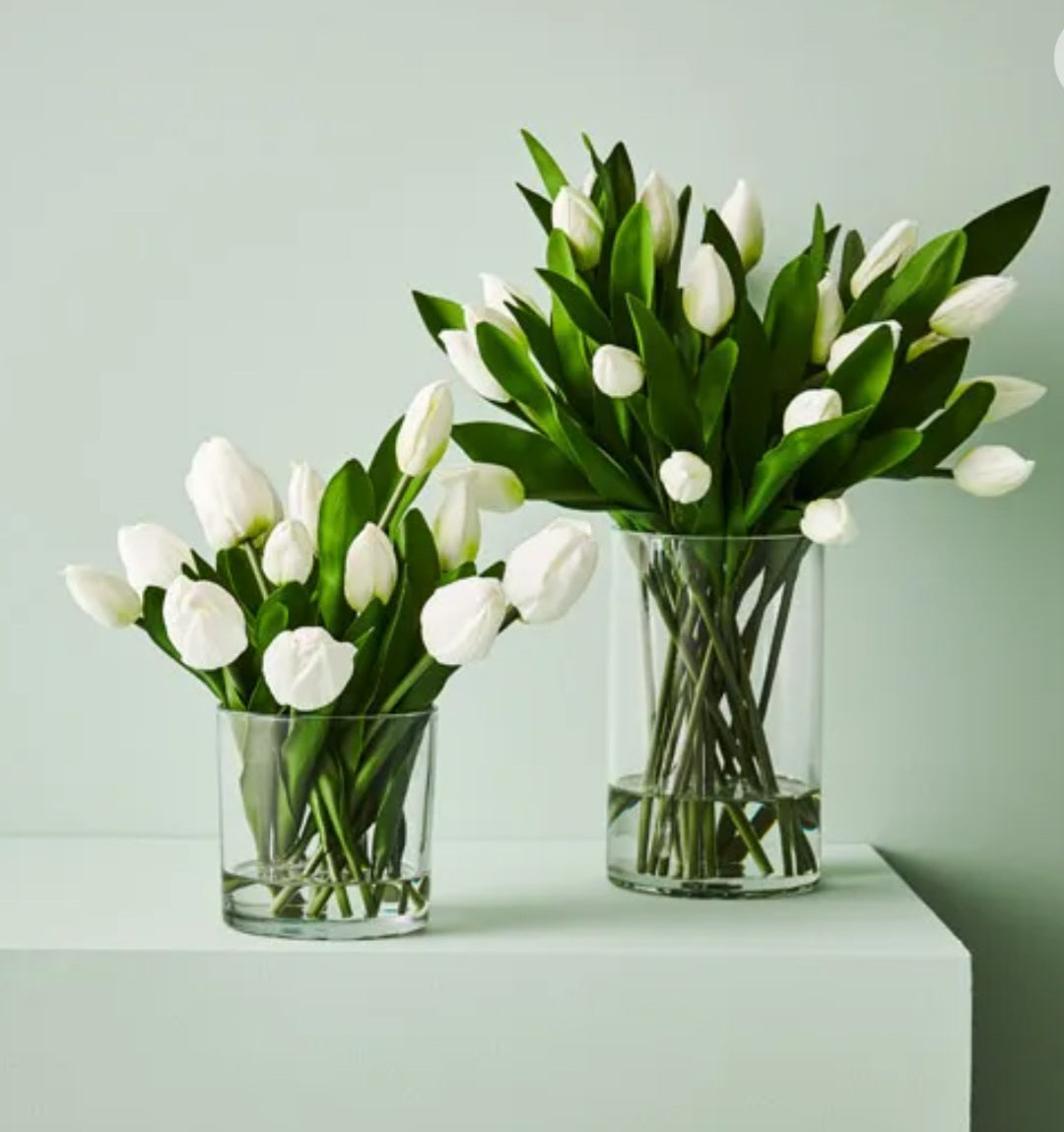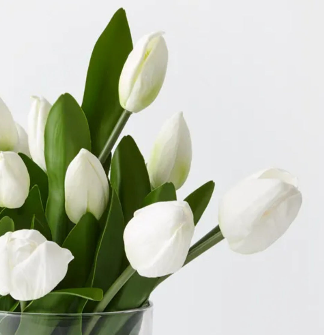Illuminate your space with the pure elegance of our White Tulip Mix in Vase. Delicately arranged, this piece showcases the timeless beauty of white tulips, exuding grace and sophistication. Elevate any room with this enchanting floral ensemble.